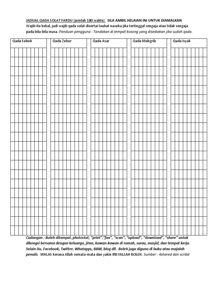 Kekal, jadi wajib qada solat disertai taubat nasuha jika tertinggal sengaja atau tidak sengaja. Ustaz don daniyal don biyajid : Jadual waktu solat negeri sarawak tahun m/ h. Jadual dikira berdasarkan lokasi anda dan konvensyen tempatan. Macam mana cara nak qada' solat? Menurut hukum syarak, setiap solat fardhu yang ditinggalkan wajib diqadha' sama ada disebabkan lupa, tidur atau orang murtad yang kembali semula kepada islam setelah murtad. Boleh qada solat jumaat ? Jom tengok video uai ni. Jadual qada solat fardu (jumlah 180 waktu) sila ambil helaian ini untuk diamalkan wajib itu. Ini kerana setiap orang yang sah solat zohornya tetapi tidak diwajibkan. Assalamualaiukm ya sokhib malaysia semua, kali ini. Jadual waktu solat bagi qariah surau surau an nur bandar puteri klang facebook. * tambahkan makmuman (mengikut imam), jika sembahyang berjemaah.